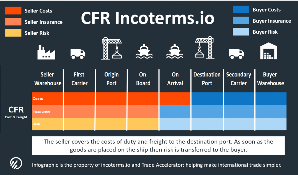 این واژه مخفف کلمات COST AND FREIGHT می باشد. یعنی ارزش و کرایه حمل تا مقصد.CFR همان C&F سابق است ولی مخصوص حمل دریایی، کالا وقتی از روی نرده کشتی عبور میکند (بارگیری میشود) مسئولیت فروشنده خاتمه میابد .هزینه بیمه با خریدار است .هزینه حمل با فروشندهاست .عقد قرارداد بیمه با خریدار است و عقد قرارداد حمل با فروشنده .
